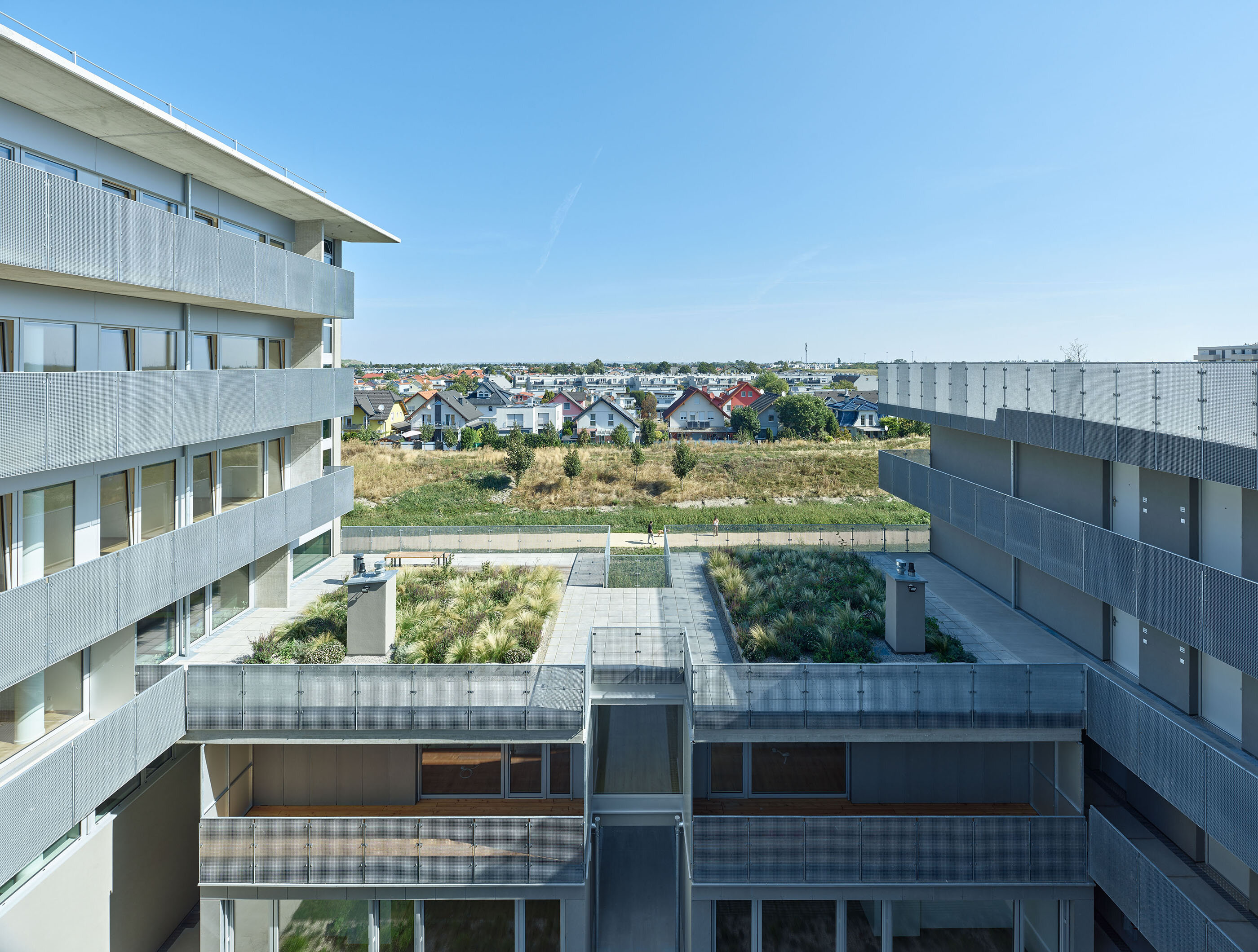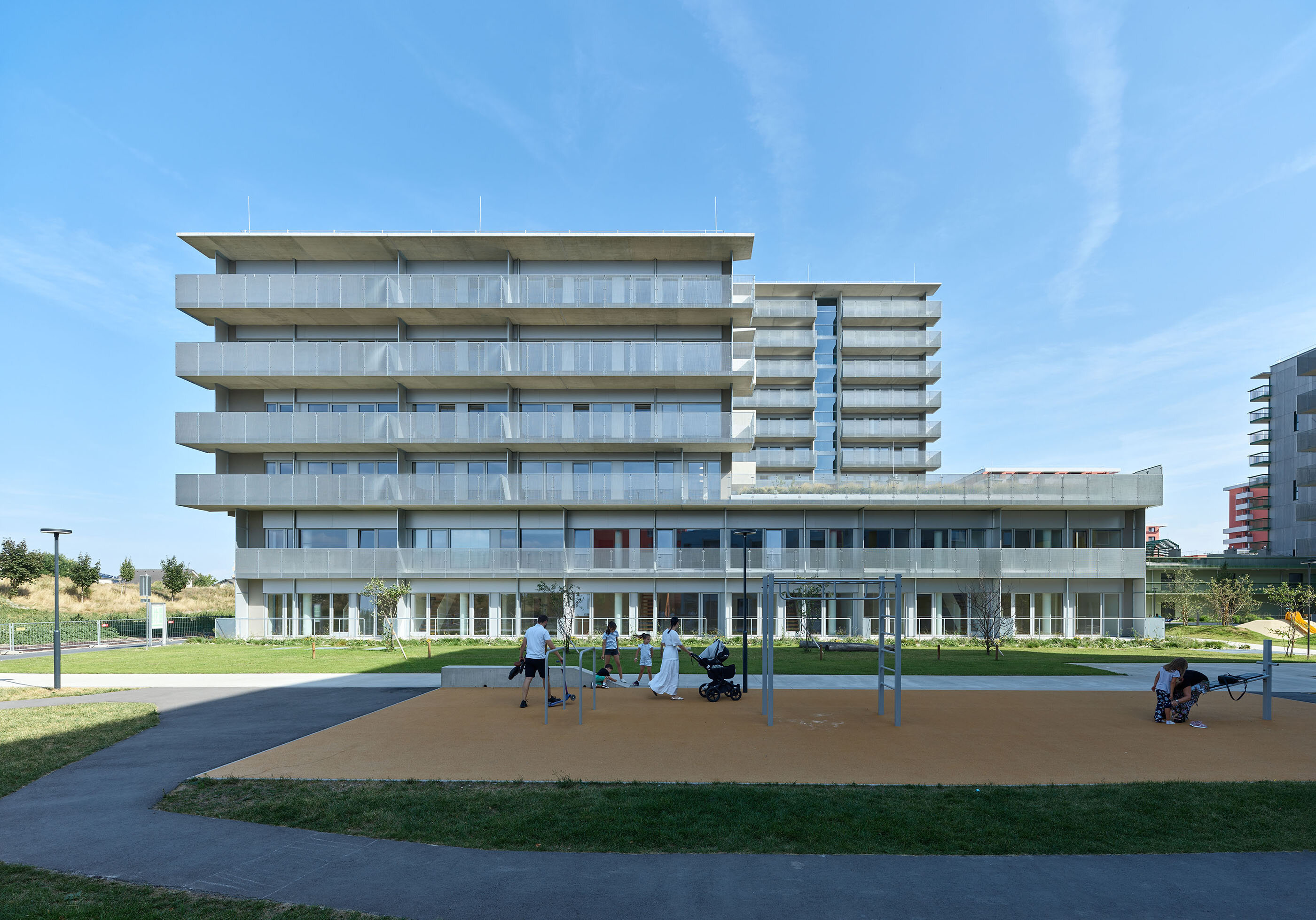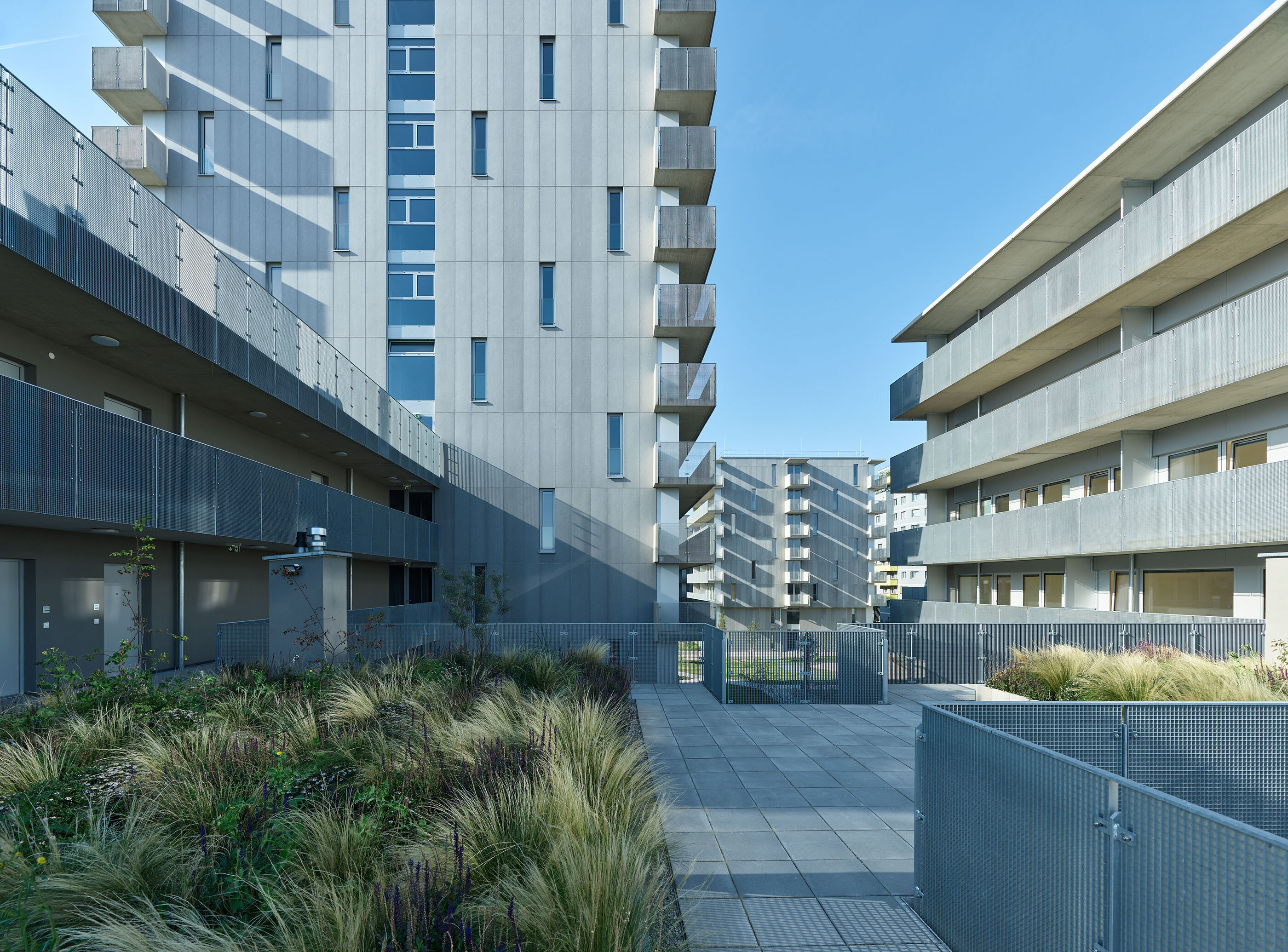 The urban design, based on five longitudinal layers for the building plots with access zones or private open spaces arranged between them, interprets the zoning requirements with a sequence of tower volumes and lower structures. This distribution of height differentiation and green spaces is strictly rational in terms of the optimal positioning of the high-rise buildings. The proportion of open spaces (loggias and balconies, pergolas, and roof terraces) is evenly and continuously distributed throughout the entire building structure.