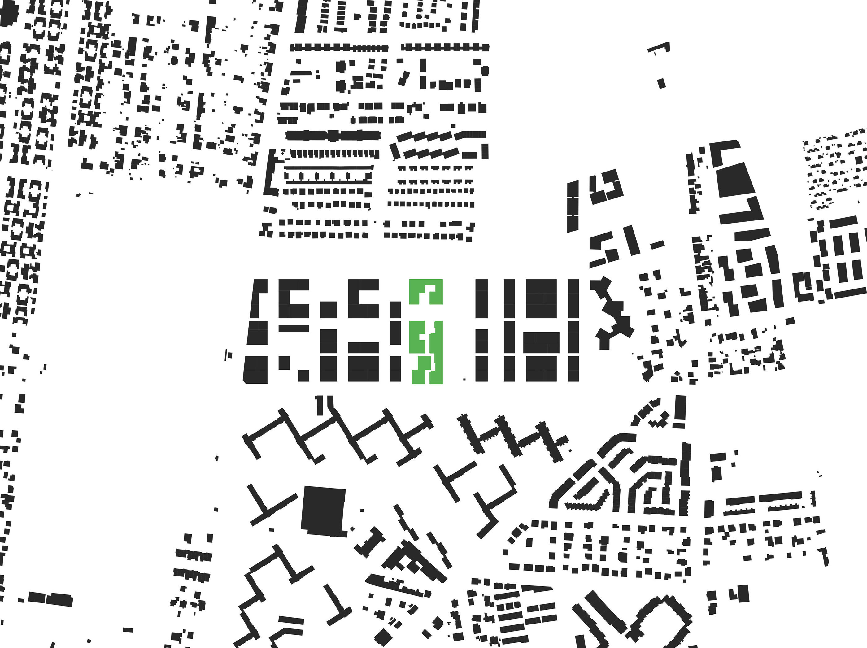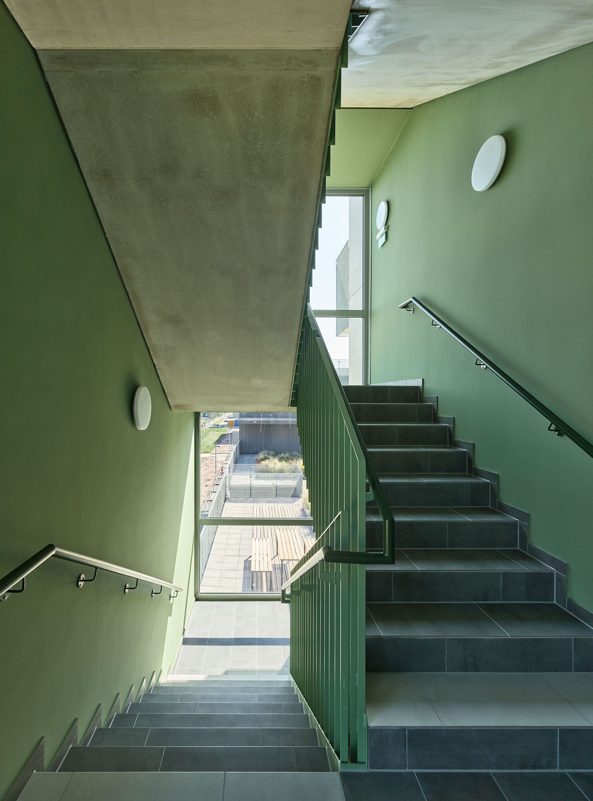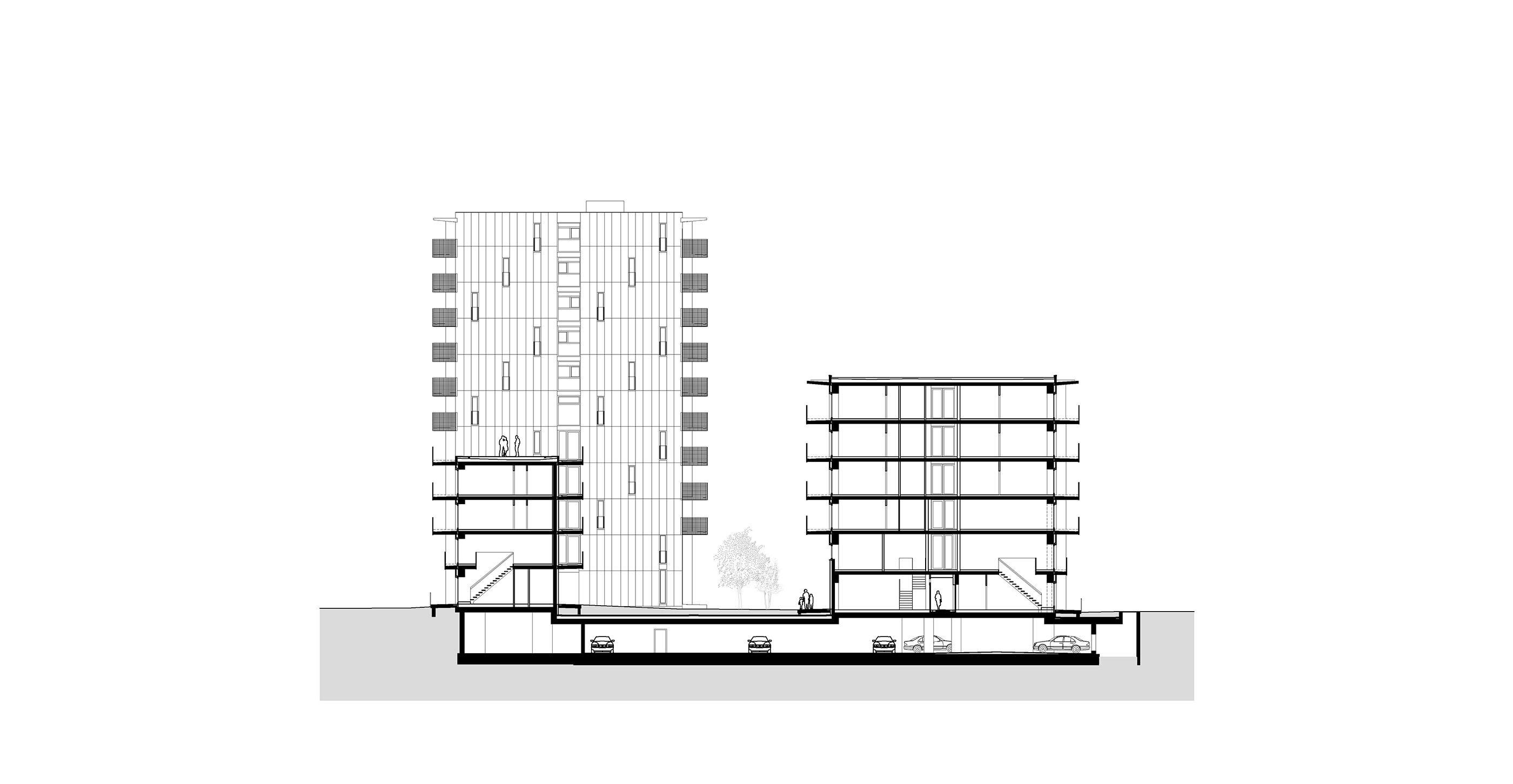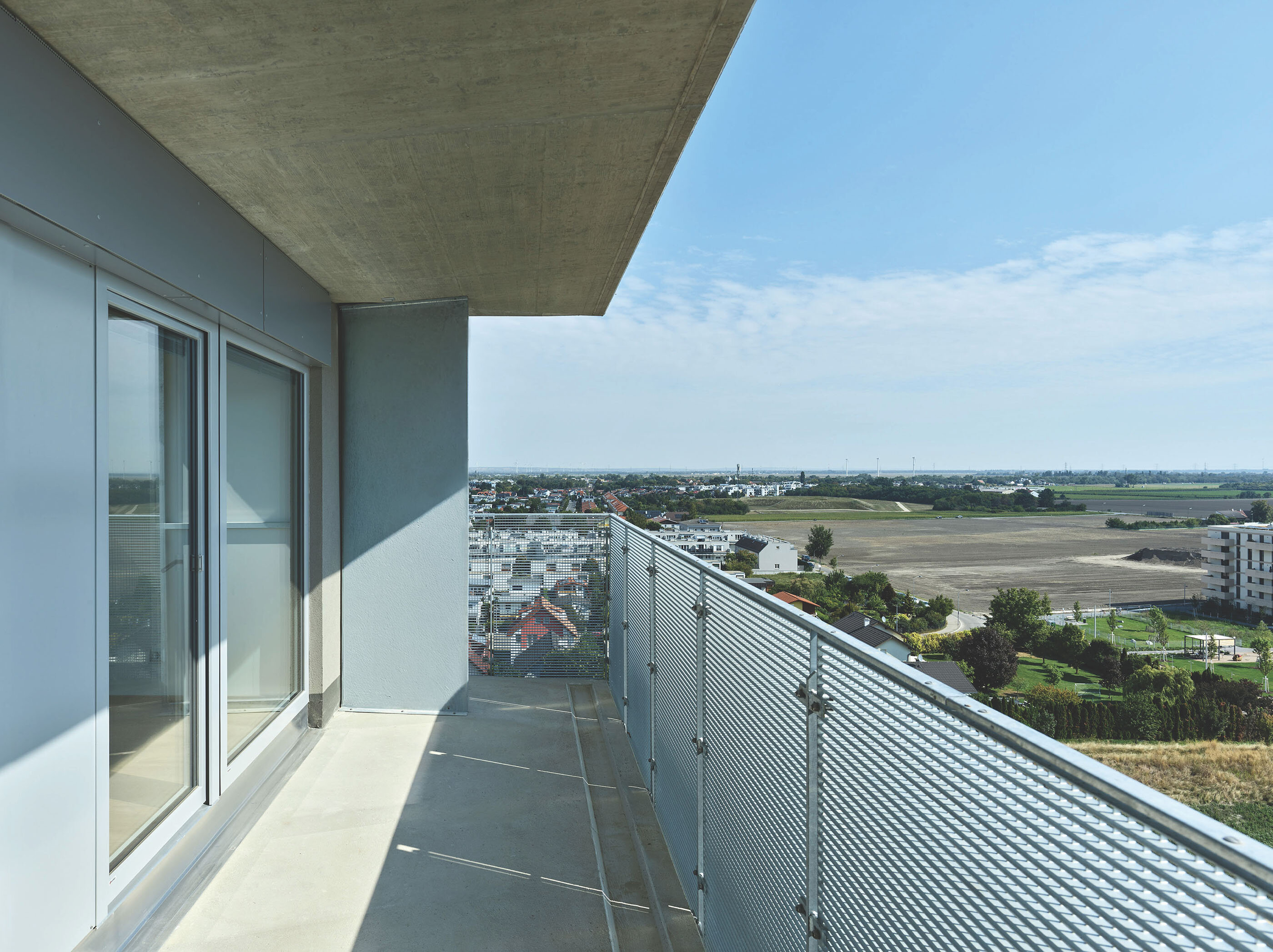 The urban design, based on five longitudinal layers for the building plots with access zones or private open spaces arranged between them, interprets the zoning requirements with a sequence of tower volumes and lower structures. This distribution of height differentiation and green spaces is strictly rational in terms of the optimal positioning of the high-rise buildings. The proportion of open spaces (loggias and balconies, pergolas, and roof terraces) is evenly and continuously distributed throughout the entire building structure.