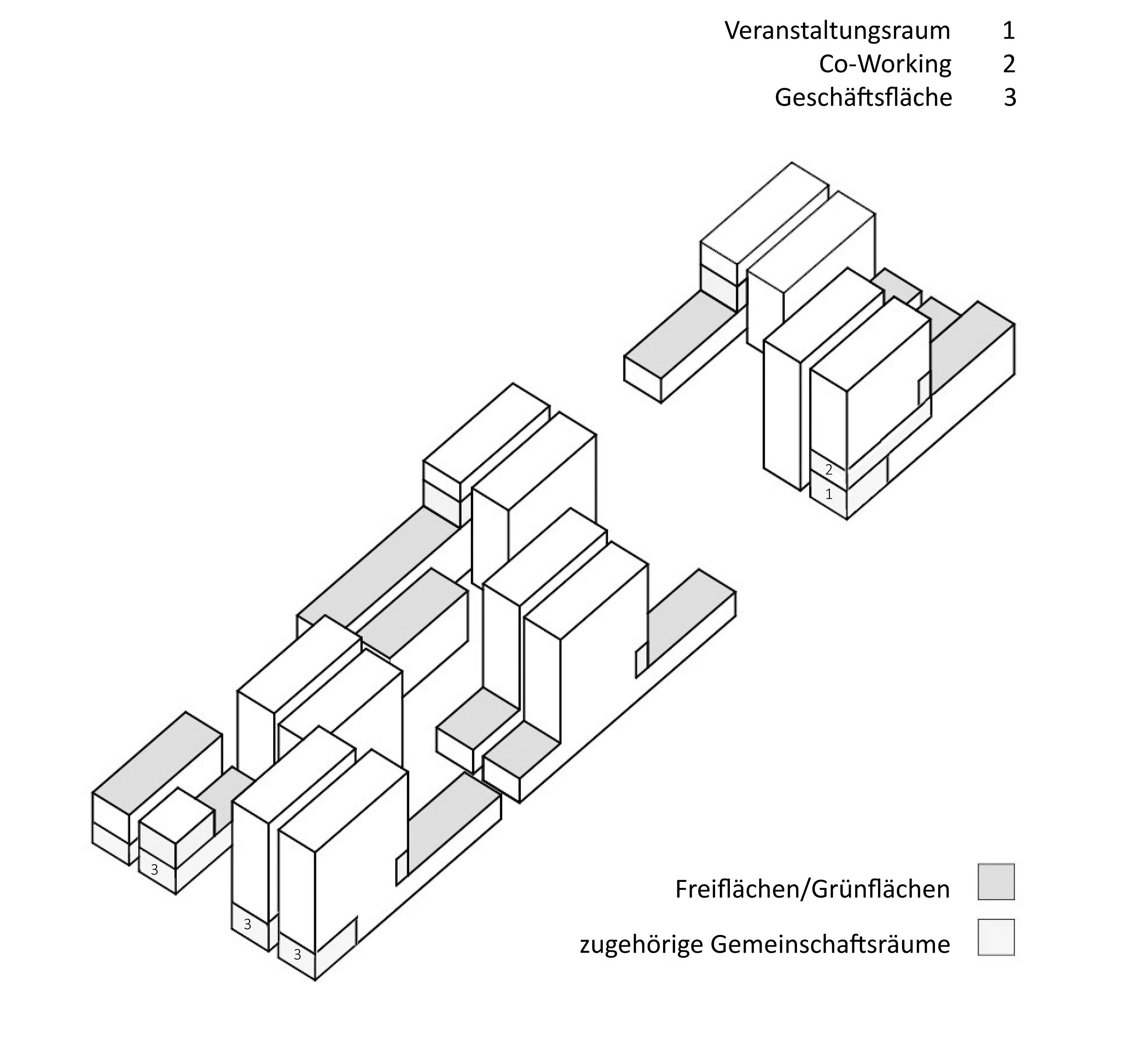 The transition between inside and outside along the transparent longitudinal facades with excellent lighting is fluid. The individual houses have spacious, partly green roof terraces with communal areas or laundry rooms. The base area of the buildings contains public functions and residential units on two levels with a room height of 3 m on the ground floor (where simple commercial use is to be permitted). Each residential and work unit has access to a private open space that is exceptionally large for social housing.