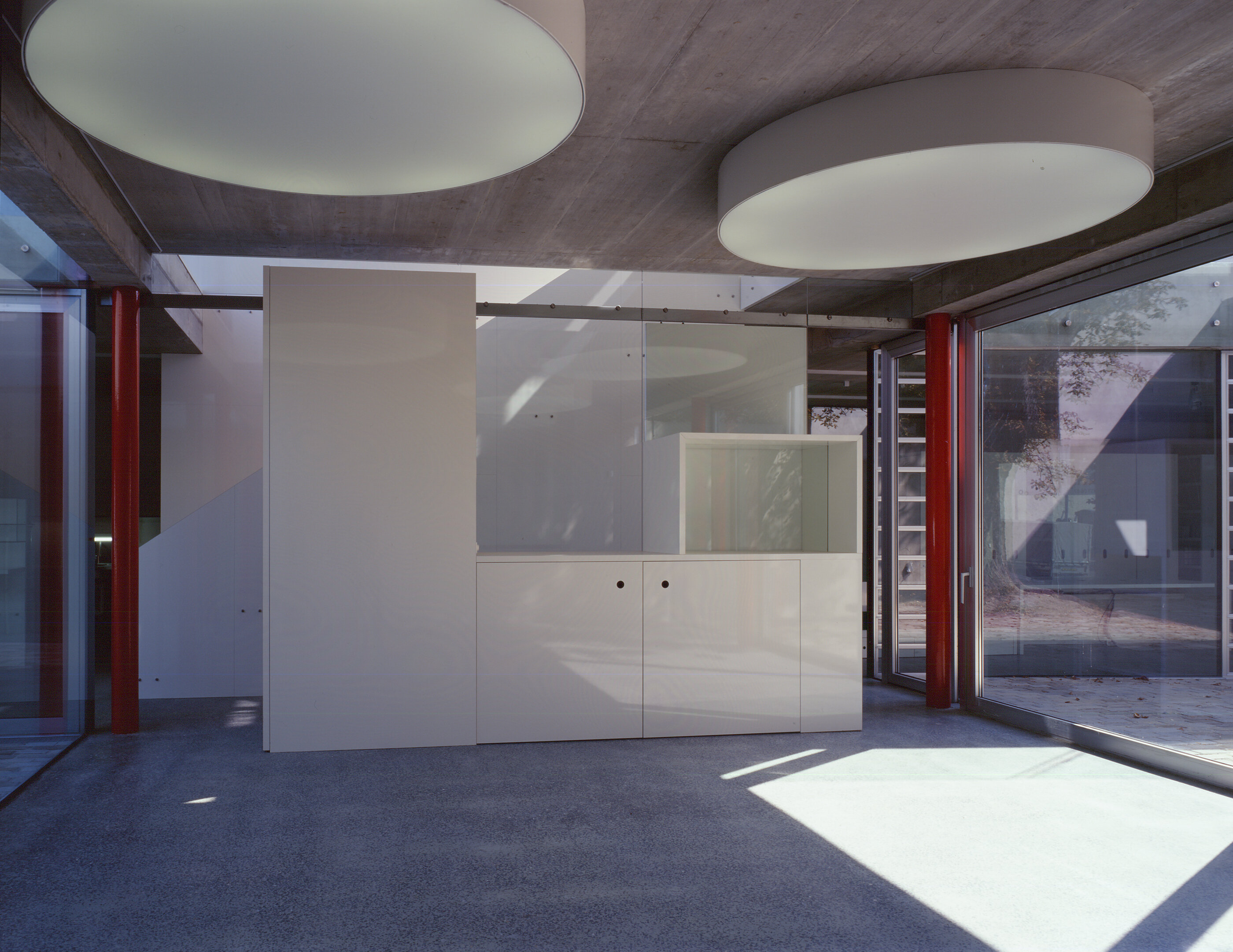 The site is in Aspern’s centuries-old core and borders two streets. Extending across the space like a flying carpet is a long-span reinforced concrete ceiling. Its ends curl up in a gesture to the adjoining streets. Inside the building, the walls and ceilings are made of cast-in-place concrete, while the ends were executed as prefabricated units. Courtyards structure the building massing. A large courtyard surrounding a chestnut tree faces a street; a small atrium with a newly planted gingko tree brings light into the pharmacy’s main space. The salesroom is structured by ribbons of light that are flush with the concrete ceiling. Where they extend into the space, they metamorphose into shelves. A display garden with medicinal herbs and a roof terrace – open to both employees and visitors – round out the spatial offerings.