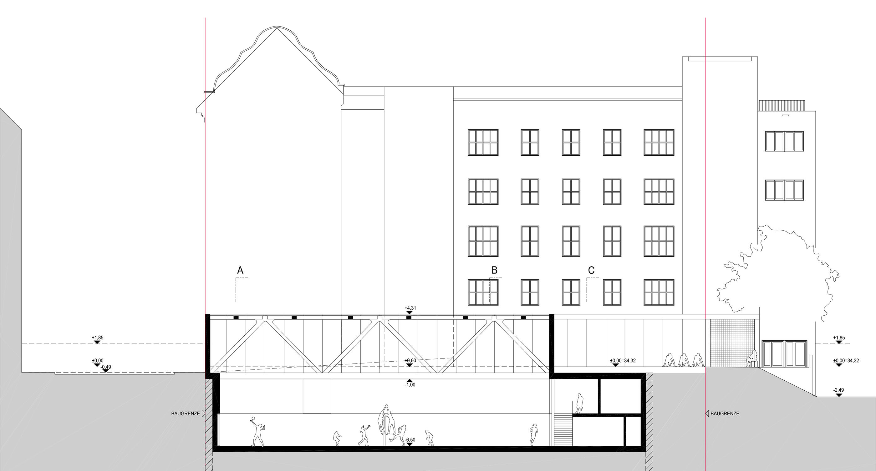 Access from the school to the gymnasia centre is inserted in the hollowed-out, sunken area of the courtyard in the existing building, allowing a direct connection to the school building on both levels. The ancillary functions garbage room and storage room for outdoor appliances together with the canopy roof to the approach form a definition at ground floor level and a plinth for the unresolved situation of the free-standing firewalls.